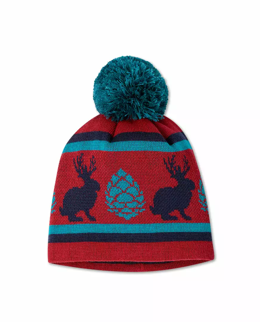 A pom hat in playful colors fit for kids, sporting a jackalope-pinecone banner and a soft fleece lining.